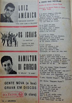 Apart from its look 'Melodias' remained basically the same: 2 thirds pop and the last third dedicated to rural music aka Sertanejo and its business. 'Melodias' was a typical Paulista publication when the bulk of Brazilian show business happened in and around São Paulo. Most novelas (Brazilian soap operas) were made in either TV Excelsior, Channel 9 or TV Tupi, Channel 4. Most musical programmes were made by TV Record, Channel 7.