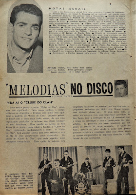 # 85, August 1964 - column 'Melodias no Disco', written by journalist DJ Ademar Dutra who took over Channel 9, TV Excelsior's 'Festival da Juventude' from Antonio Aguilar when he was signed by TV Record, Channel 7 to MC 'Reino da Juventude' in partnership with Eliana Pittman. Teens had at least weekly 2 rock shows. Ronnie Cord was on top of the world having just had a # 1 with 'Rua Augusta'.